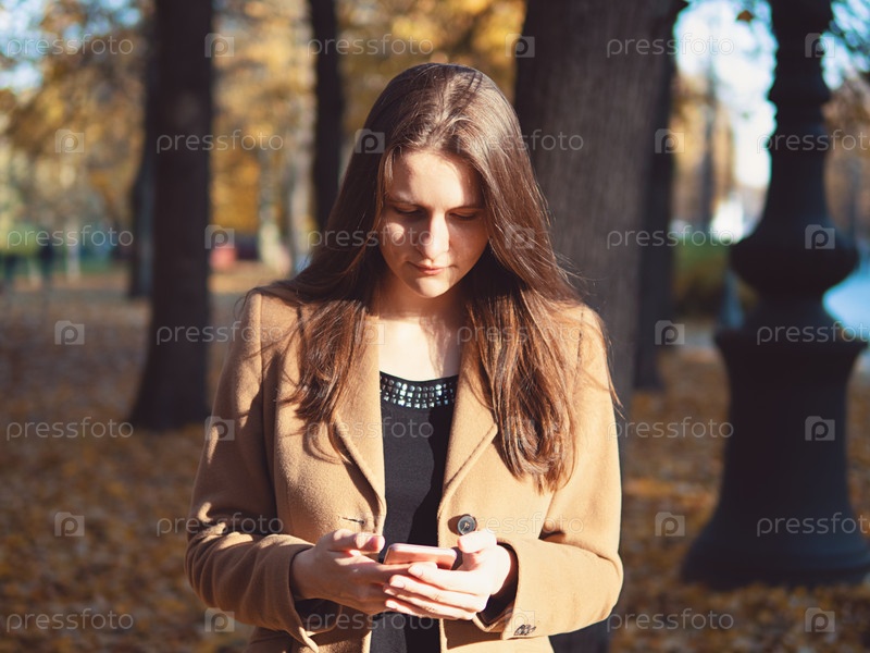 Красивая девушка-подросток в парке, держащая смартфон и общающаяся онлайн в Интернете. Молодая женщина с длинными волосами