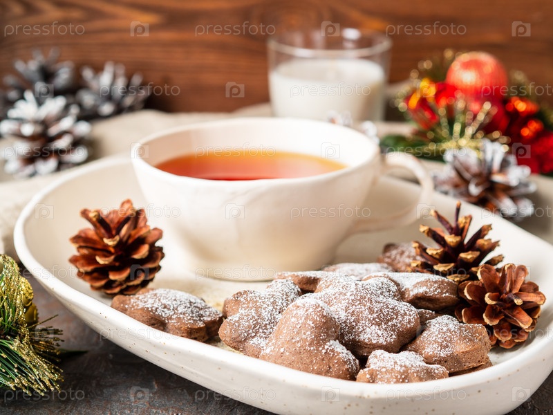 Рождественская или новогодняя открытка. Зимняя праздничная композиция, вид сбоку, селективный фокус, коричневый деревянный фон. Чай, печенье, шишки, свечи, подарок