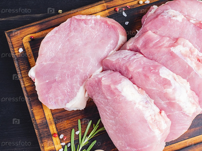 Свиной стейк, сырое филе карбоната на темном фоне, мясо с розмарином,