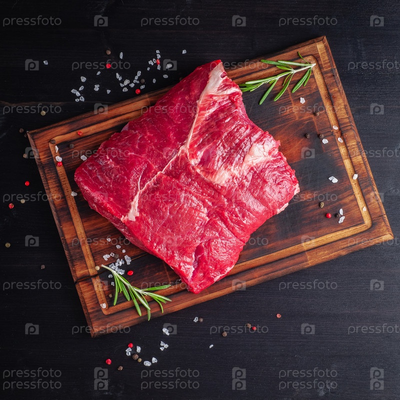 Сырое мясо, говяжий стейк с приправами на разделочной доске на темном фоне с розмарином,