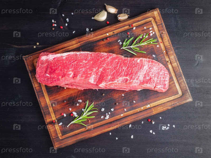 Целый кусок сырого мяса. Свежий большой говяжий стриплойн со специями на разделочной доске на темном фоне, вид сверху
