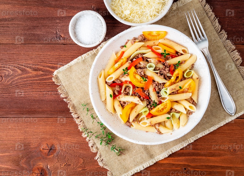 Паста пенне с желтыми помидорами, красными и зелеными овощами, мясным фаршем на темном деревянном фоне, вид сверху, место для копирования