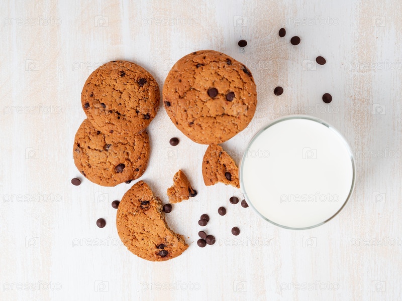 Овсяное печенье с шоколадными каплями и молоком в стакане, полезный перекус. Светлый фон, белый деревянный стол, вид сверху