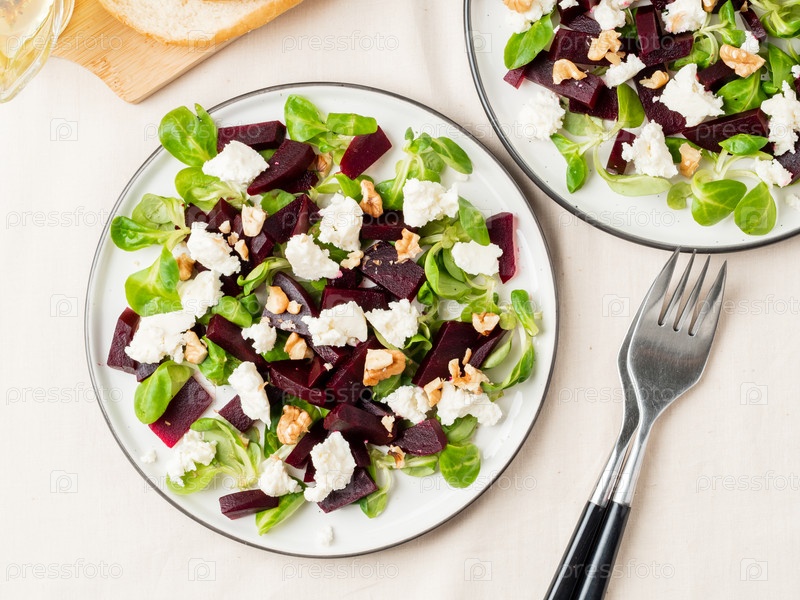 Салат из свеклы с фетой, сыром, грецкими орехами, кукурузным салатом и рассольным сыром, маринованный на белом столе, вид сверху