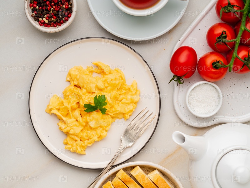 Яичница-болтунья, Омлет. Завтрак с жареными яйцами, чашкой чая, помидорами на белом каменном мраморном фоне. Вид сверху