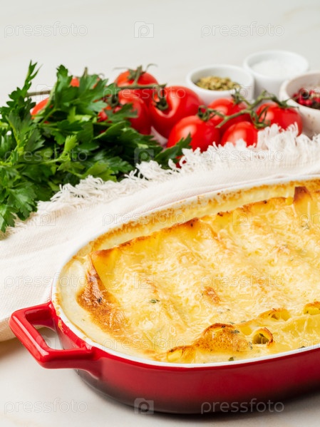 Каннеллони с начинкой из рикотты и петрушки, запеченные под соусом бешамель, вид сбоку, вертикальный