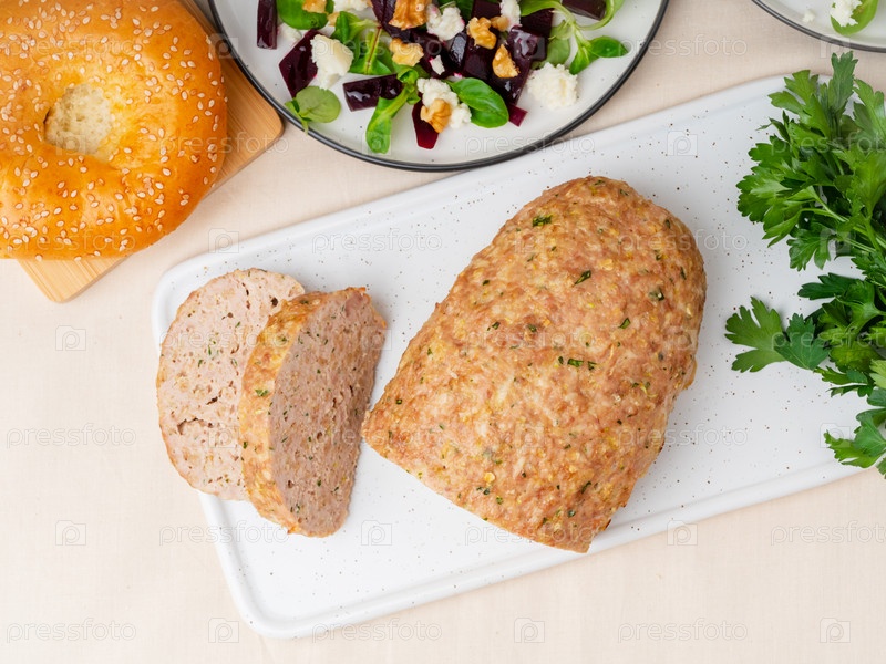Террин, мясной рулет. Запеченный фарш из индейки. Традиционное французское и американское блюдо. Вид сверху, белый мраморный фон