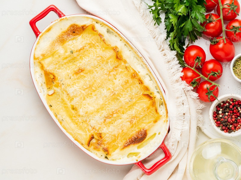 Каннеллони с начинкой из рикотты и петрушки, запеченные под соусом бешамель, вид сверху, белый мраморный фон