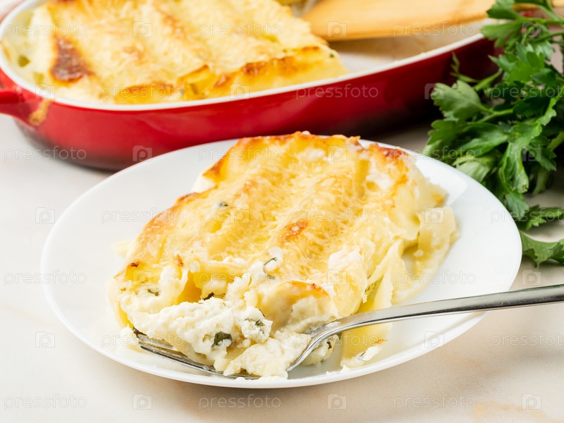 Каннеллони с начинкой из рикотты и петрушки, запеченные с соусом бешамель, вид сбоку, фон белый мрамор