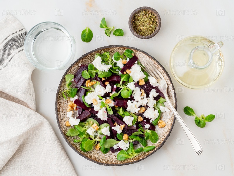 Салат из свеклы с фетой, сыром, грецкими орехами, кукурузным салатом на белом столе, вид сверху