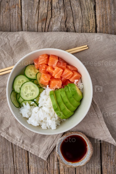 Поке с лососем, свежей рыбой, рисом, огурцом, авокадо