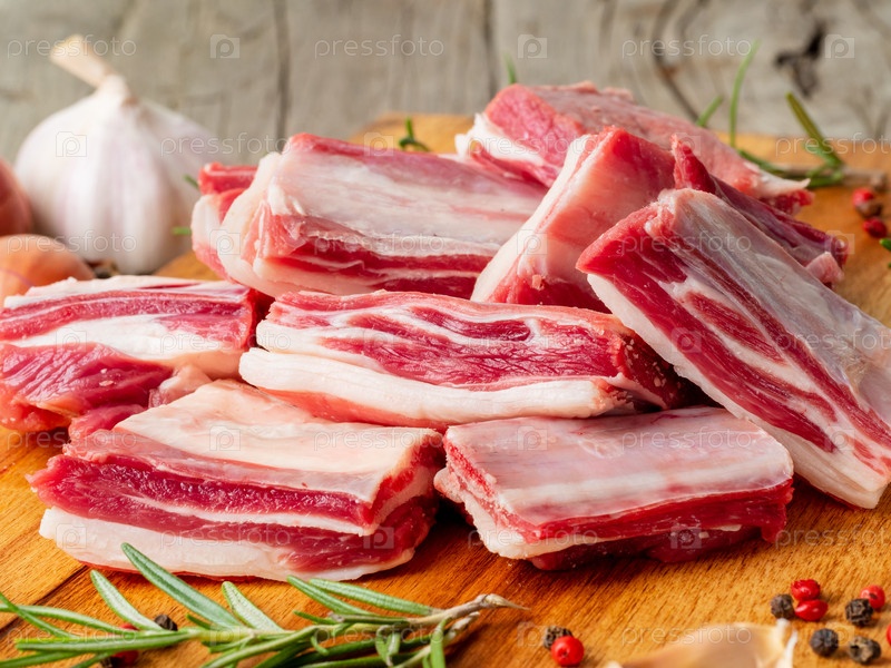 Небольшие кусочки сырых бараньих ребрышек на деревянной разделочной доске