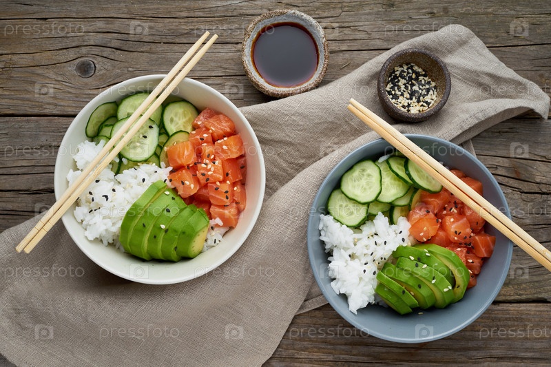 Поке с лососем, свежей рыбой, рисом, огурцом, авокадо