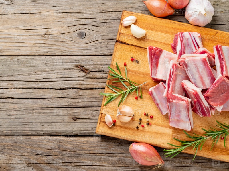 Небольшие кусочки сырых бараньих ребрышек на деревянной разделочной доске на старом деревенском деревянном фоне, вид сверху, место для копирования