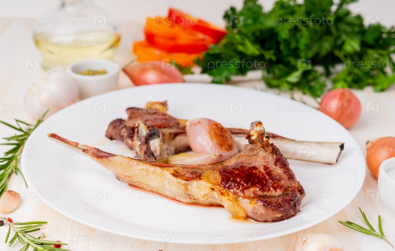 Жареные бараниные ребра на белой тарелке с овощами и пряностями на белом мраморном столе, вид со стороны кетогенный, палео, LCHF, диета с высоким содержанием жиров