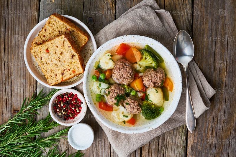 Суп с фрикадельками в белой тарелке на старом деревянном деревенском сером столе, вид сверху