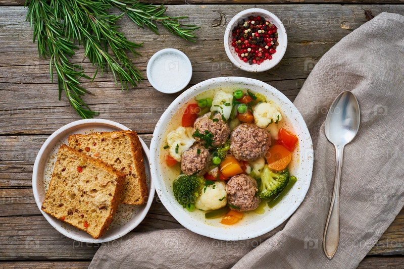 Суп с фрикадельками в белой тарелке на старом деревянном деревенском сером столе, вид сверху