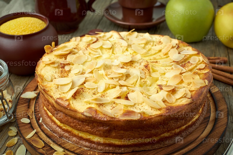 Чизкейк, яблочный пирог, творожный десерт с полентой, яблоками, миндальными хлопьями и корицей на темном деревянном кухонном столе, вид сбоку