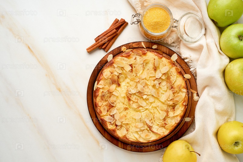Чизкейк, яблочный пирог, творожный десерт с полентой, яблоками, миндальными хлопьями и корицей на белом мраморном кухонном столе, вид сверху, место для копирования