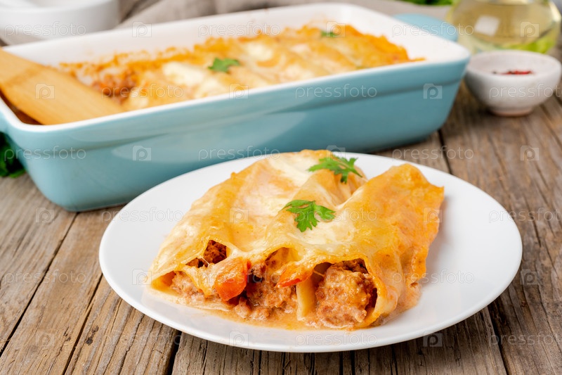 Каннеллони с начинкой из говяжьего фарша, помидоров, запеченные с томатным соусом бешамель, вид сбоку, старый темный деревянный фон