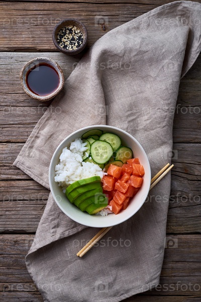 Поке из лосося со свежей рыбой, рисом, огурцом, авокадо с черным и белым кунжутом. Концепция еды, вид сверху, вертикальный
