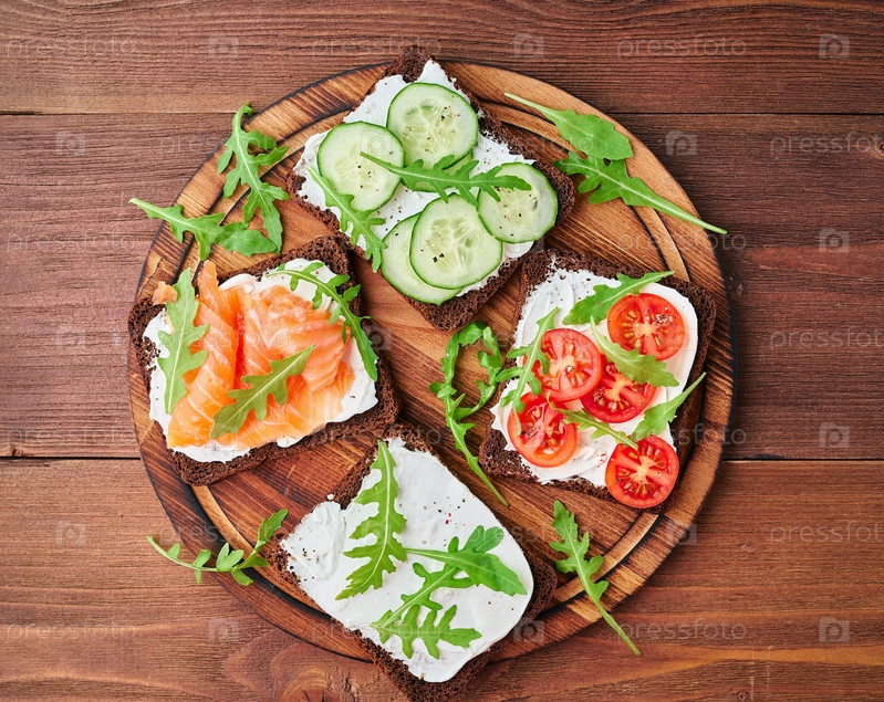 Черный ржаной хлеб с лососем, сливочным сыром, огурцами, помидорами на темно-коричневом деревянном фоне