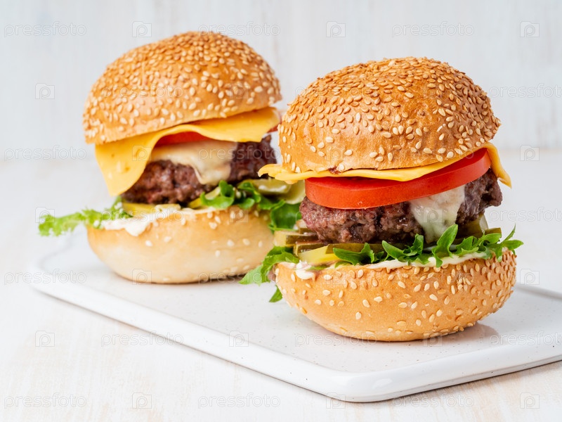 Два гамбургера на белой доске на белом фоне, горячая домашняя нездоровая жирная еда