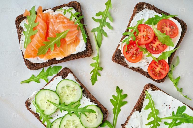 Черный ржаной хлеб с лососем, сливочным сыром, огурцом, помидорами на деревянном фоне