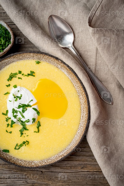 Полента, каша с сыром пармезан и яйцом пашот, вертикальная на старом темном деревянном фоне, вид сверху. традиционная итальянская кухня
