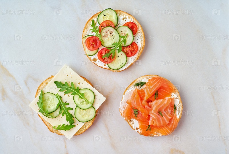 Три восхитительных открытых сэндвича с лососем, помидорами, огурцом и сыром на светлом мраморном столе