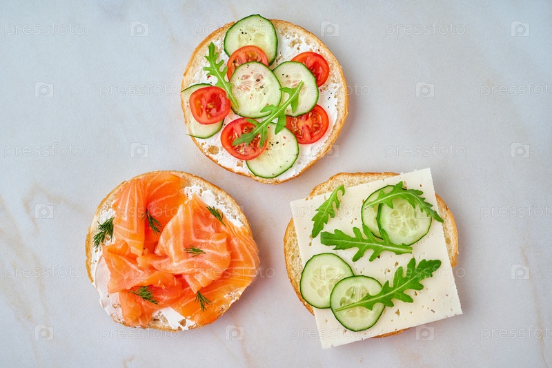 Три восхитительных открытых сэндвича с лососем, помидорами, огурцом и сыром на светлом мраморном столе