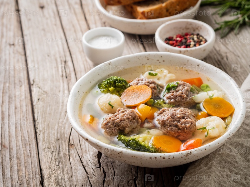 Суп с фрикадельками в белой тарелке на старом деревянном деревенском сером столе, вид сбоку