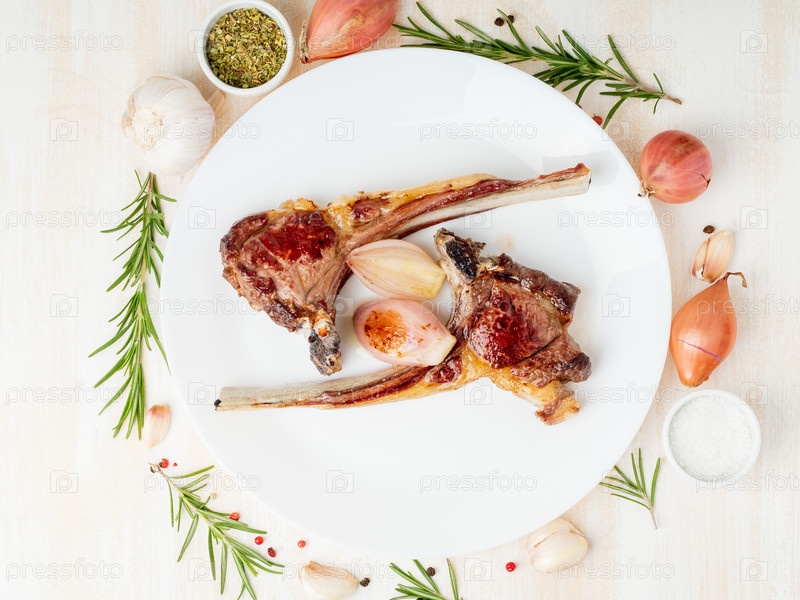 Жареные бараниные ребра на белой тарелке с овощами и пряностями на белом мраморном столе, вид сверху кетогенный, палео, LCHF, диета с высоким содержанием жиров