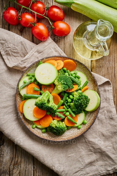Смесь отварных овощей, паровых овощей для диетического низкокалорийного питания. Брокколи, морковь, цветная капуста, вид сверху