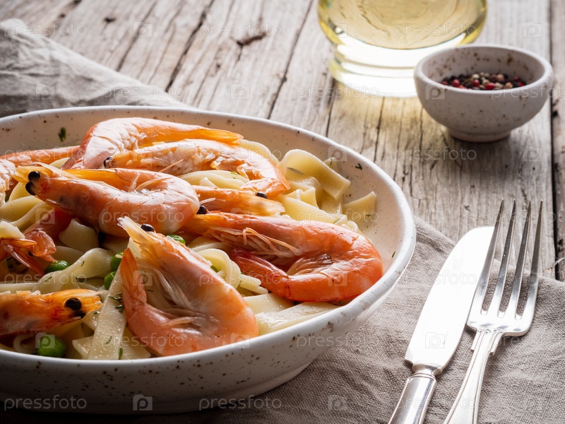 Креветки, паста тальятелле, зеленый горошек, укроп. Белая тарелка на старом деревенском деревянном столе, вид сбоку