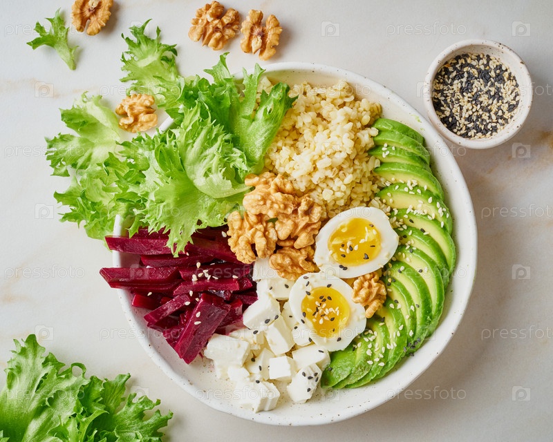 Чаша Будды, сбалансированное питание, вегетарианское меню. Серый мраморный стол, вид сверху. Яйца, авокадо, салат-латук, булгур, свекла, тофу