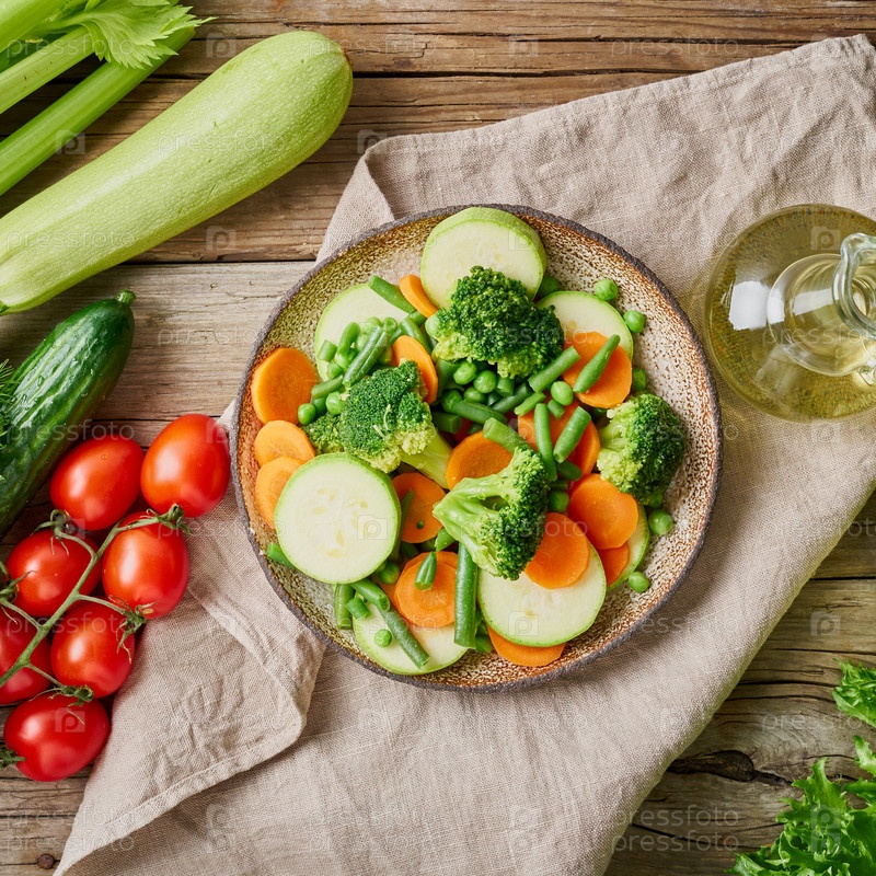 Смесь отварных овощей, паровых овощей для диетического низкокалорийного питания. Брокколи, морковь, цветная капуста, вид сверху