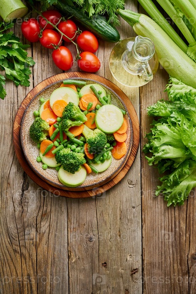 Смесь отварных овощей, паровых овощей для диетического низкокалорийного питания. Вертикально. Брокколи, морковь, цветная капуста, вид сверху