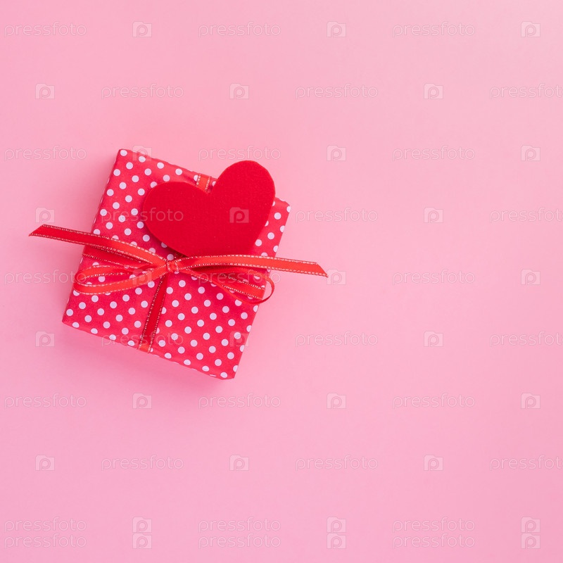 Подарок в красной подарочной коробке с бантом, красное сердце, розовый фон, вид сверху, пустое место для текста