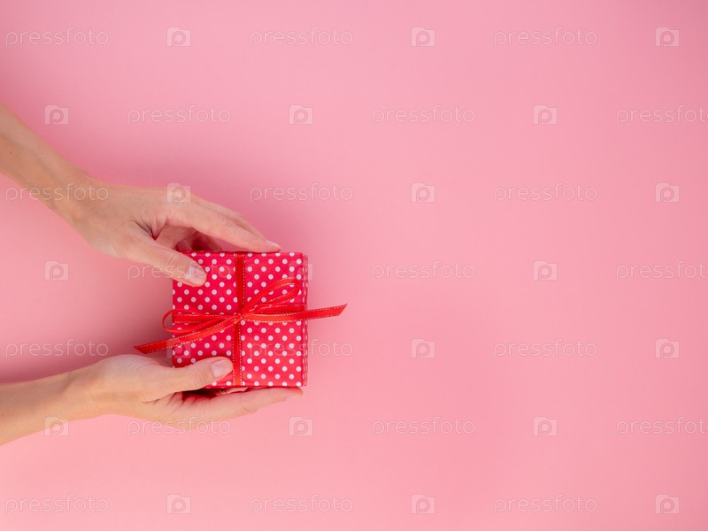 Женщина держит подарок в красной подарочной коробке с бантом, розовый фон, вид сверху, пустое место для текста