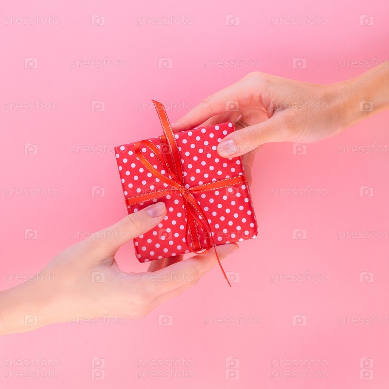 Две женщины держат подарок в красной подарочной коробке с бантом, передавая его от одной к другой,