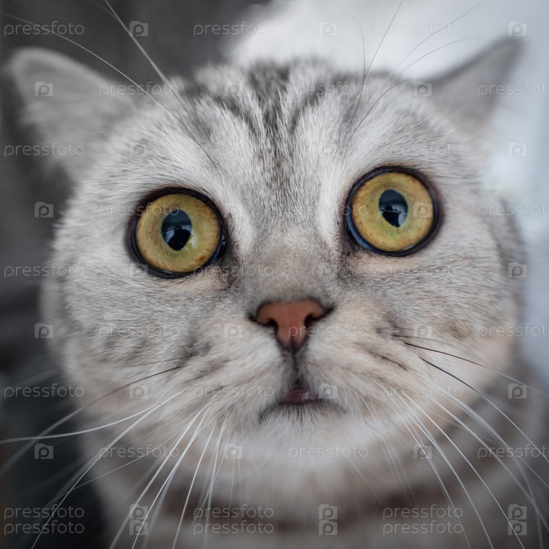 Удивленный полосатый кот смотрит прямо в камеру, нюхает нос. Портрет головы кота крупным планом, рыбий глаз