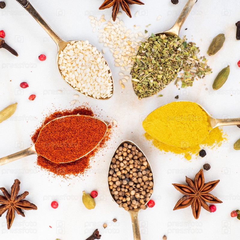 Набор специй в ложках на белом фоне, вид сверху. Паприка, карри, лавровый лист, анис и другие приправы, плоская раскладка