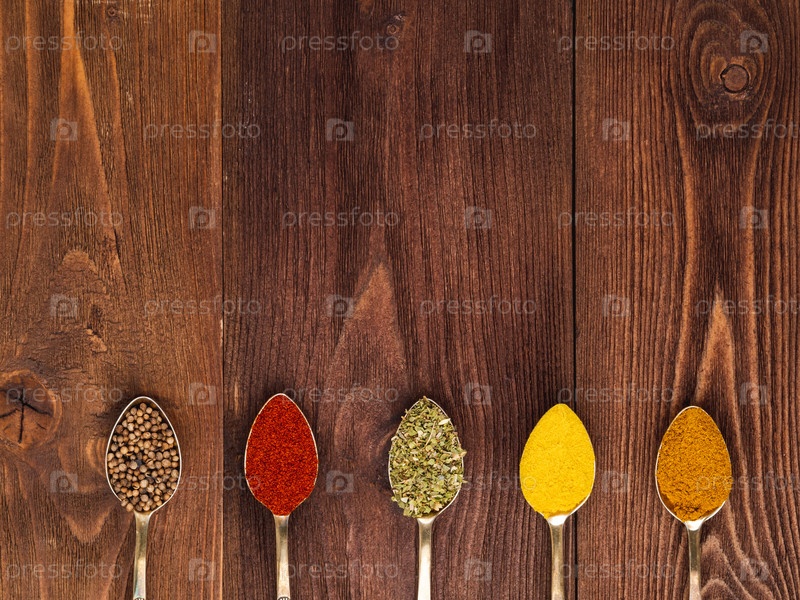 Набор специй в ложках на деревянном фоне, вид сверху. Концепция меню ресторана. Приправа - паприка, карри, анис