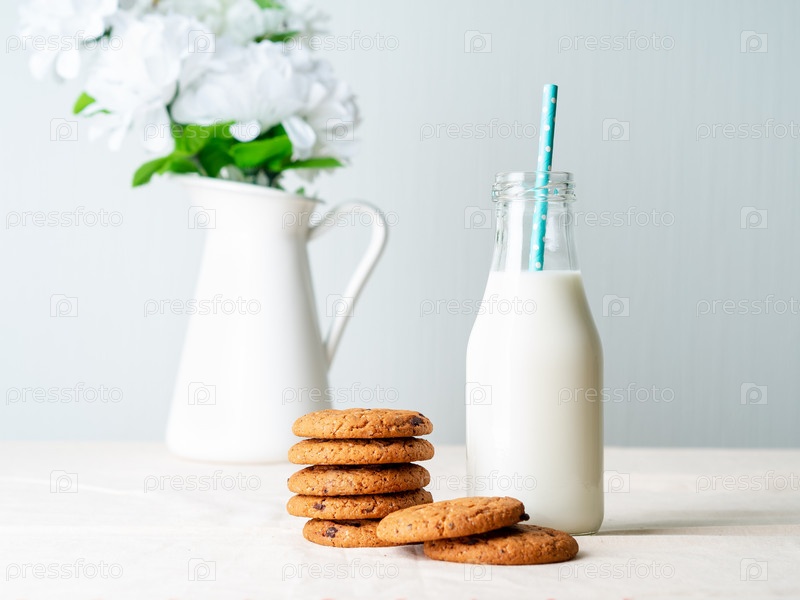 Шоколадное овсяное печенье и молоко в бутылке, полезный перекус. Светлый фон, серая светлая стена
