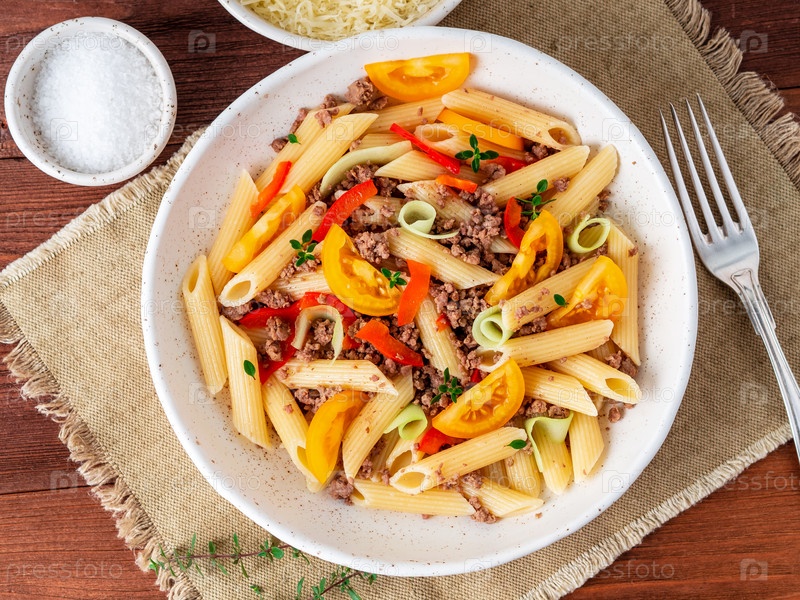 Паста пенне с желтыми помидорами, красными и зелеными овощами, мясным фаршем на темном деревянном фоне, вид сверху, крупный план
