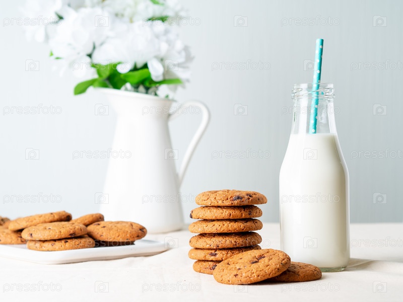 Шоколадное овсяное печенье и молоко в бутылке, полезный перекус. Светлый фон, серая светлая стена