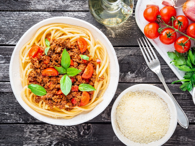Паста болоньезе с томатным соусом, рубленой говядиной, листьями базилика на темном деревенском деревянном столе, вид сверху