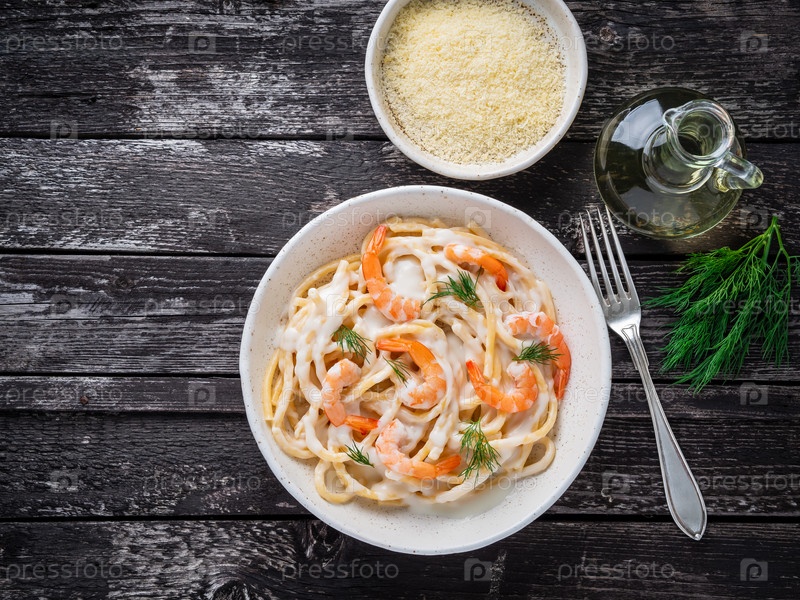 Итальянская паста спагетти с креветками, соусом бешамель и рубленым укропом на темном деревенском деревянном столе, вид сверху, место для копирования