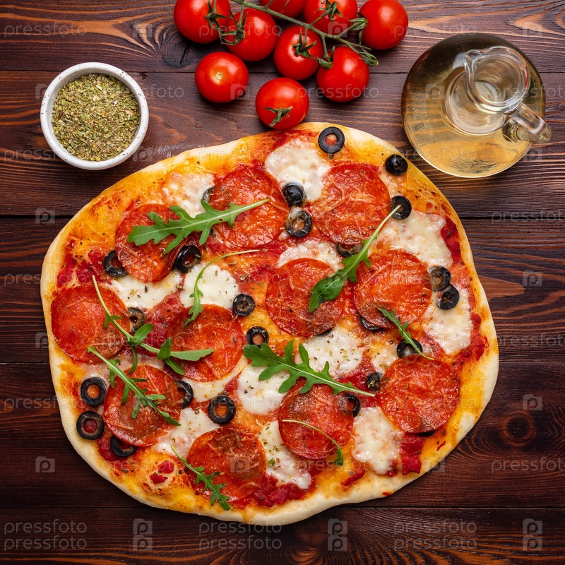 Горячая домашняя итальянская пицца пепперони с салями, моцареллой и оливками на темно-коричневом деревянном столе, вид сверху